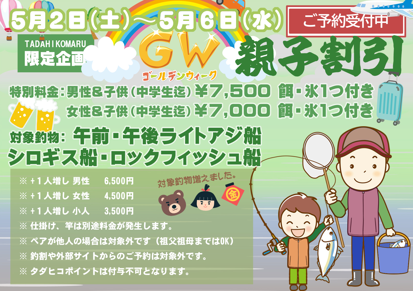 午前ライトアジ船(2隻高低) 17~28cm 8~61匹 午後ライトアジ船 17~28cm 15~45匹 トラフグ船(3隻高低) 0.8~3.5kg 0~3匹 ...